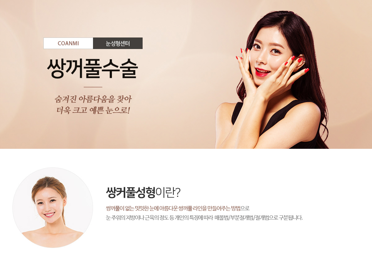 쌍꺼풀이 없는 밋밋한 눈에 아름다운 쌍꺼풀 라인을 만들어주는 방법으로 눈 주위의 지방이나 근육의 정도 등 개인의 특징에 따라 매몰법/부분절개법/절개법으로 구분됩니다.