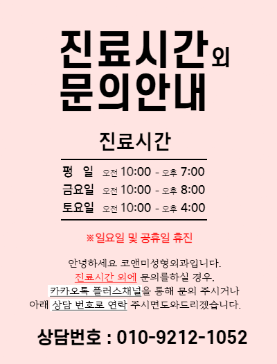 진료시간 안내 월요일 오전 10:00 ~ 오후 07:00 화요일 오전 10:00 ~ 오후 07:00 수요일 오전 10:00 ~ 오후 07:00 목요일 오전 10:00 ~ 오후 07:00 금요일 오전 10:00 ~ 오후 08:00 토요일 오전 10:00 ~ 오후 04:00 주말/공휴일은 휴진입니다.