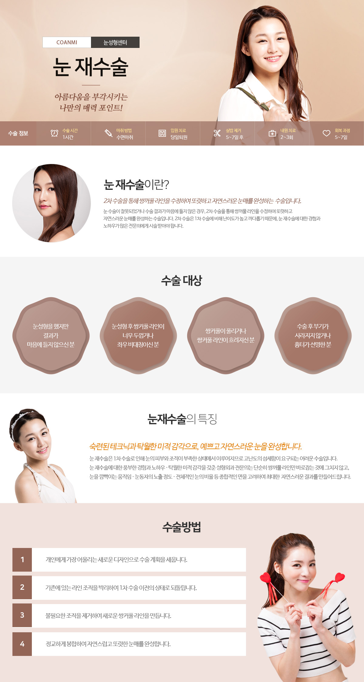 눈 재수술 아름다움을 부각시키는 나만의 매력 포인트! 2차 수술을 통해 쌍꺼풀 라인을 수정하여 또렷하고 자연스러운 눈매를 완성하는 수술입니다. 눈 수술이 잘못 되었거나 수술 결과가 마음에 들디 않은 경우, 2차 수술을 통해 쌍꺼풀 라인을 수정하여 또렷하고 자연스러운 눈매를 완성하는 수술입니다. 2차 수술은 1차 수술에 비해 난이도가 높고 까다롭기 때문에, 눈 재수술에 대한 경험과 노하우가 많은 전문의에게 시술 받아야 합니다. 수술 대상: 눈 성형을 했지만 결과가 마음에 들지 않으신 분, 눈 성형 후 쌍꺼풀 라인 너무 두껍거나 좌우 비대칭이신 분, 쌍꺼풀이 풀리거나 쌍꺼풀 라인이 흐려지신 분, 수술 후 부기가 사라지지 않거나 흉터가 선명한 분. 눈 재수술의 특징: 숙련된 테크닉과 탁월한 미적 감각으로, 예쁘고 자연스러운 눈을 완성합니다. 눈 재수술은 1차 수술로 인해 눈의 피부와 조직이 부족한 상태에서 이루어지므로 고난도의 섬세함이 요구되는 어려운 수술입니다. 눈 재수술에 대한 풍부한 경험과 노하우, 탁월한 미적 감각을 갖춘 성형외과 전문의는 단순히 쌍꺼풀 라인만 바로잡는 것에 그치지 않고, 눈을 깜빡이는 움직임, 눈동자의 노출 정도, 전체적인 눈의 비율 등 종합적인 면을 고려하여 최대한 자연스러운 결과를 만들어 드립니다. 수술 방법: 개인에서 가장 어울리는 새로운 디자인으로 수술 계획을 세웁니다. 기존에 있는 라인 조직을 박리하여 1차 수술 이전의 상태로 되돌립니다. 불필요한 조직을 제거하여 새로운 쌍꺼풀 라인을 만듭니다. 정교하게 봉합하여 자연스럽고 또렷한 눈매를 완성합니다.