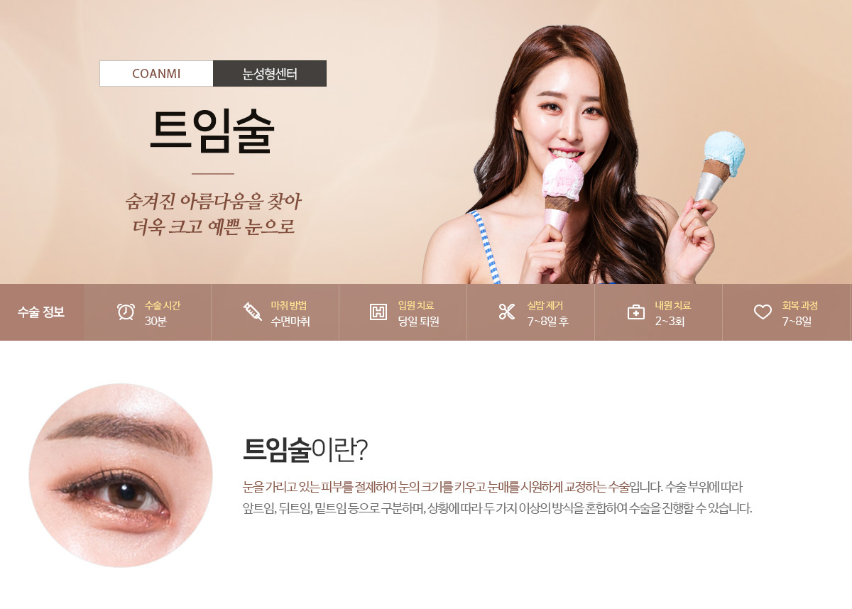 트임술의 특징: 단순히 눈의 크기만 키우는 것이 아니라 눈매의 모양과 눈꼬리의 높이를 조절함으로써 개성이 살아 있는 자신만의 눈매 스타일을 만들어 드립니다. 다시 붙지 않는 트임 테크닉1 더 크고 시원해진 눈매! 흉터 및 부기 최소화! 티나지 않는 자연스러움!