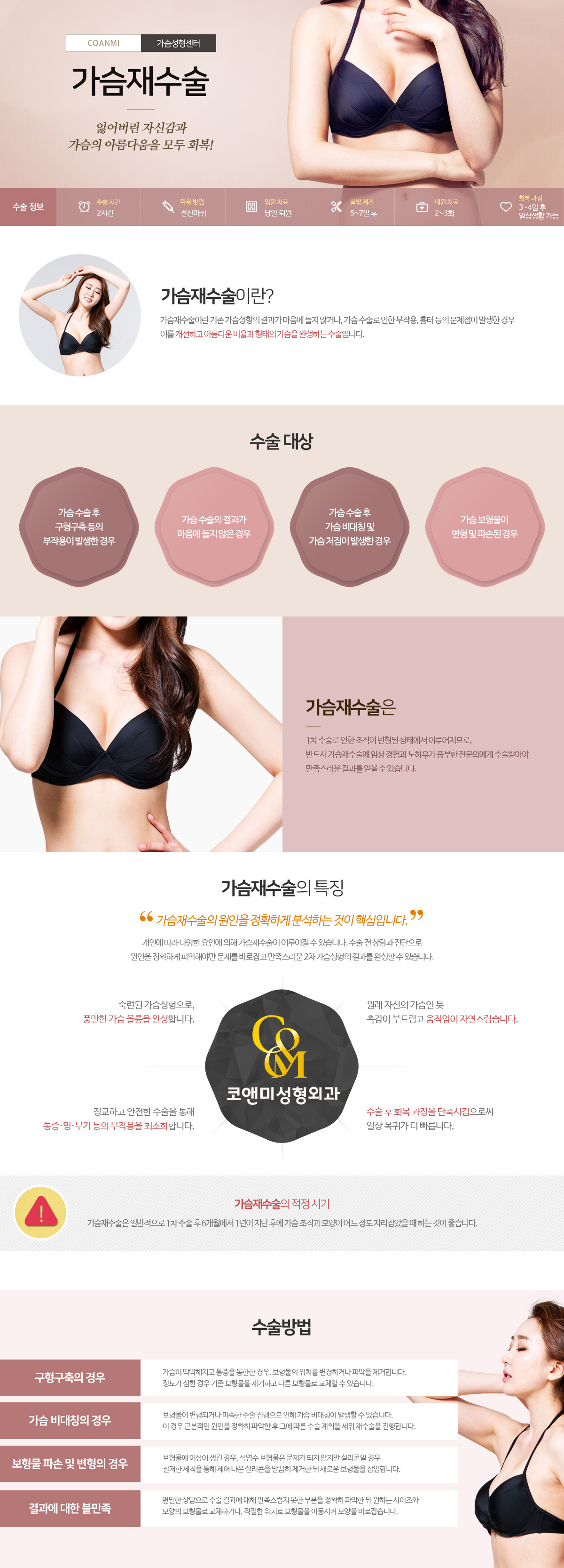 수술 대상: 가슴 수술 후 구형구축 등의 부작용이 발생한 경우; 가슴 수술의 결과가 마음에 들디 않은 경우; 가슴 수술 후 가슴 비대칭 및 가슴 처짐이 발생한 경우; 가슴 보형물이 변형 및 파손된 경우.