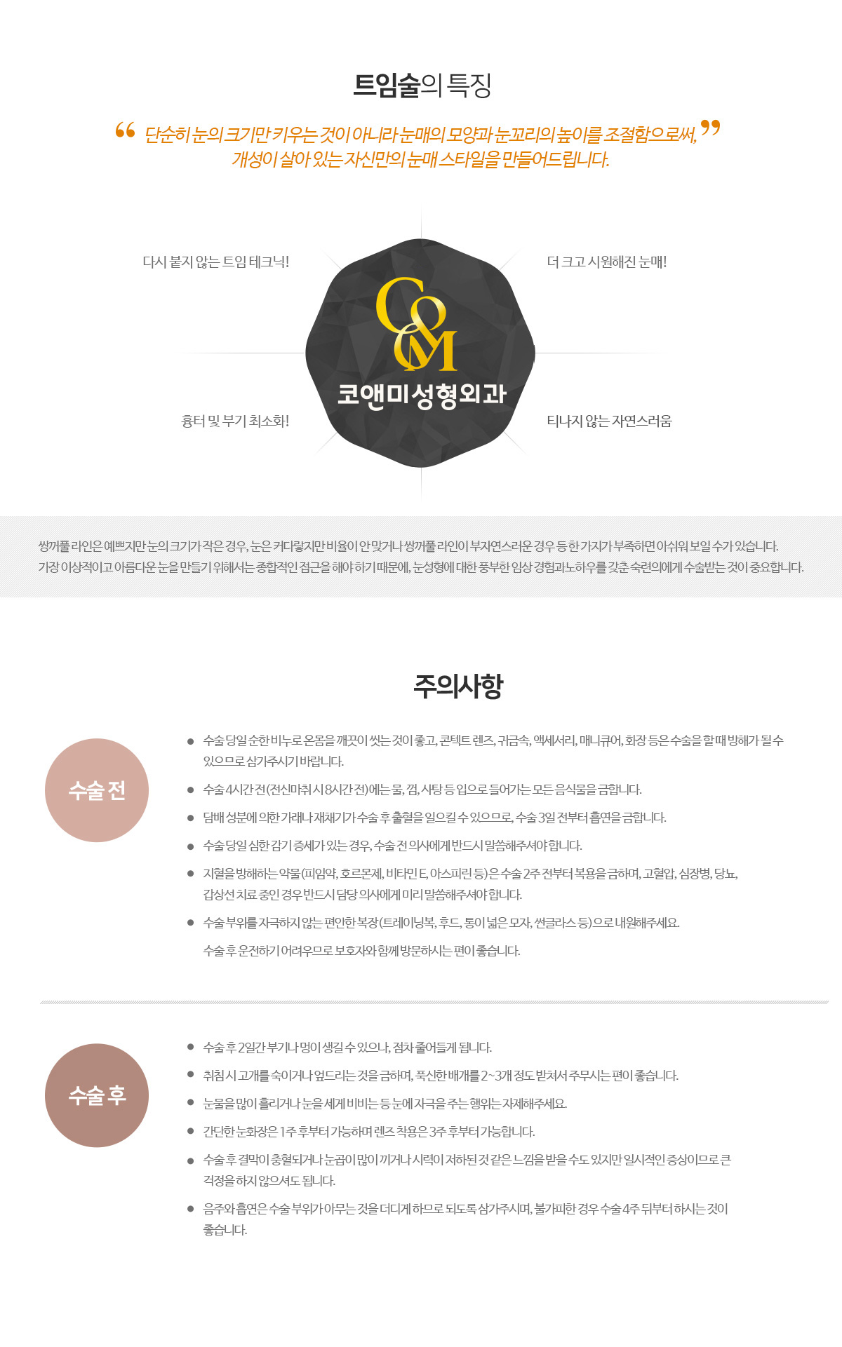 트임술의 특징: 단순히 눈의 크기만 키우는 것이 아니라 눈매의 모양과 눈꼬리의 높이를 조절함으로써 개성이 살아 있는 자신만의 눈매 스타일을 만들어 드립니다. 다시 붙지 않는 트임 테크닉1 더 크고 시원해진 눈매! 흉터 및 부기 최소화! 티나지 않는 자연스러움! 쌍꺼풀 라인은 예쁘지만 눈의 크기가 작은 경우, 눈은 커다랗지만 비율이 안 맞거나 쌍꺼풀 라인이 부자연스러운 경우 등 한 가지가 부족하면 아쉬워 보일 수가 있습니다. 가장 이상적이고 아름다운 눈을 만들기 위해서 종합적인 접근을 해야 하기 때문에, 눈 성형에 대한 풍부한 임상 경험과 노하우를 갖춘 숙련의 에게 수술 받는 것이 중요합니다.