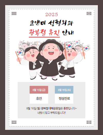 진료시간 안내 월요일 오전 10:00 ~ 오후 07:00 화요일 오전 10:00 ~ 오후 07:00 수요일 오전 10:00 ~ 오후 07:00 목요일 오전 10:00 ~ 오후 07:00 금요일 오전 10:00 ~ 오후 08:00 토요일 오전 10:00 ~ 오후 04:00 주말/공휴일은 휴진입니다.